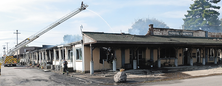 Firefighters continued with mop up efforts and extinguishing hot spots late Tuesday morning after a fire destroyed the National Apartments in Scottsburg. None of the residents were injured in the fire.