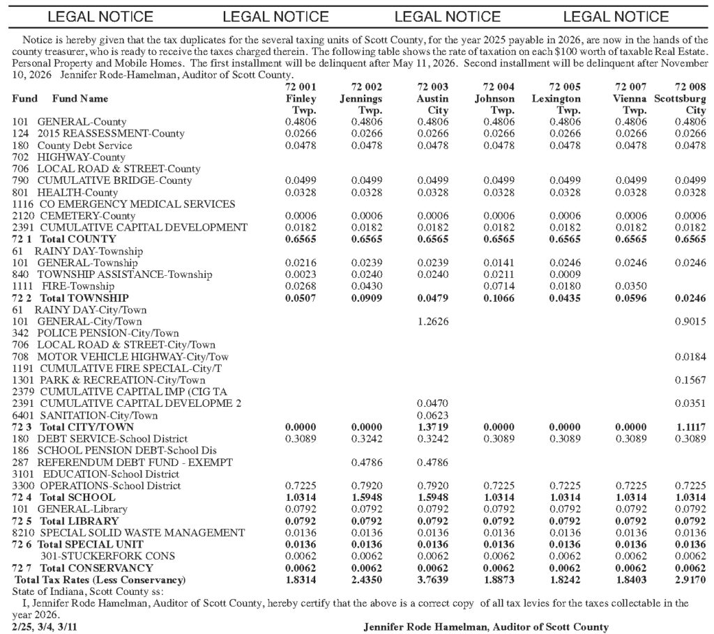 The voters of Scott County are notified in accordance with Indiana Code 3-8-2-19 that a primary election will be held within the county on May 5th , 2026. with the polls open from 6:00 a.m. until 6:00 p.m., prevailing local time. I certify that based on the declarations of candidacy filed in the office of the county election board (or the Lake, Porter, or Tippecanoe County Boards of Elections and Registration) and the public questions certified to me by the State of Indiana or this county’s election board, the following individuals and public questions will be placed on the primary election ballot: