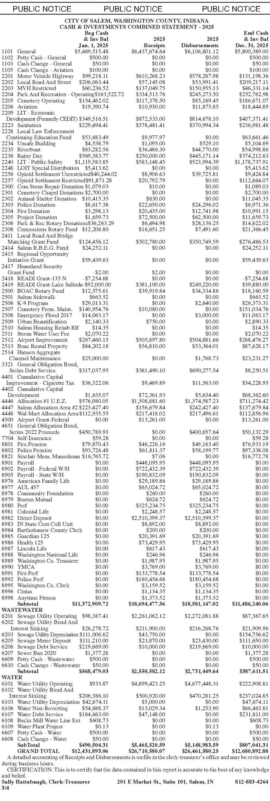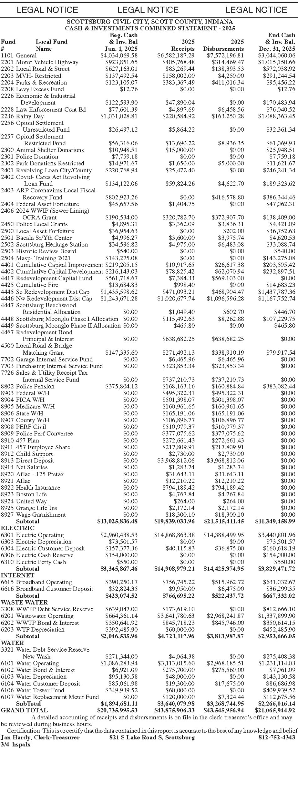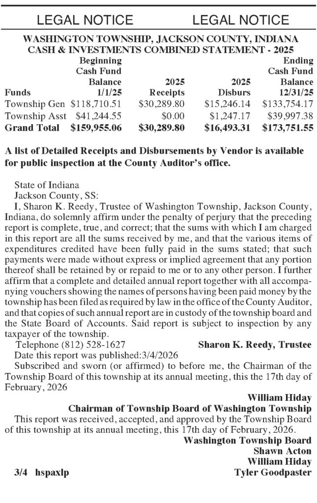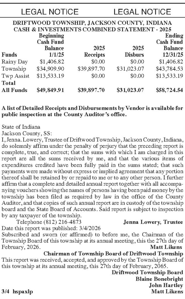 Dated at Brownstown, Indiana this 12th day of January, 2026