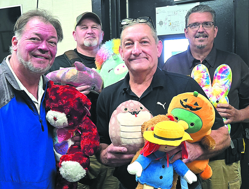 John Myers of WMPI (left) presents stuffed animals to Deputy Johnny Coomer, Sheriff Jerry Goodin (center) and Jail Commander Doug Herald.